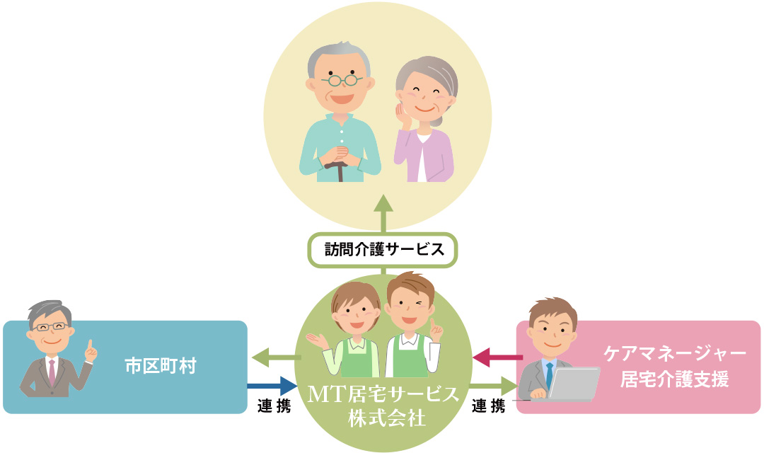 市区町村・ケアマネージャーと連携し、利用者様のご自宅へお伺いして介護サービスをご提供します。