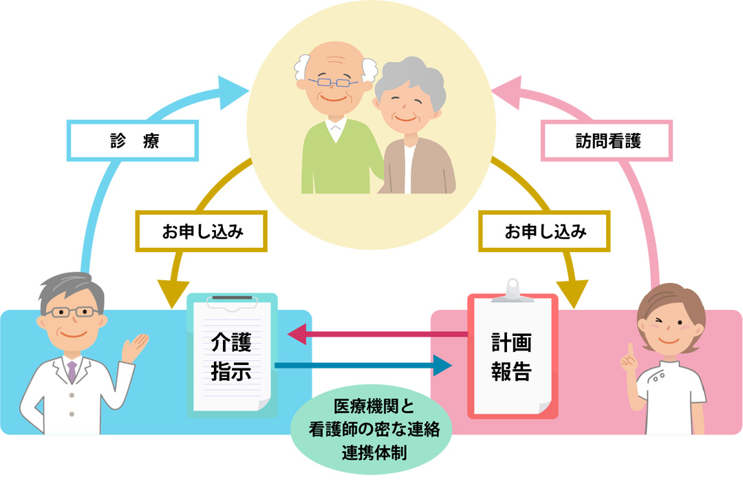 かかりつけのお医者様と当訪問看護ステーションで協力し、利用者様の療養生活を見守り、適切なケアとアドバイスを提供させていただきます。